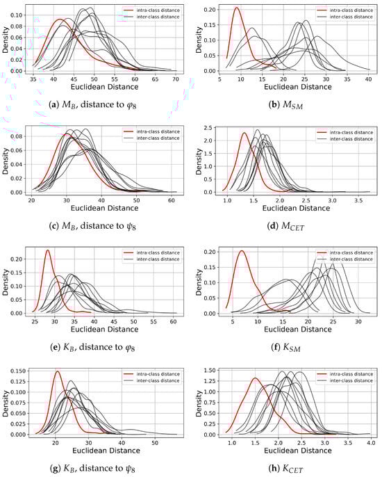 Distributions of intra-class distance and inter-class distance to the reference point of class 8. The black lines represent the distances between the feature vectors in (for ) and the reference point of the class 8 for each keypad input class i.