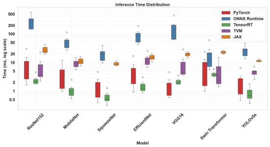 Six pretrained models were selected to represent a diverse range of neural network architectures and computational complexities. These include ResNet-152 [28], MobileNetV2 [29], SqueezeNet [8], EfficientNet-B0 [30], VGG16 [27], Swin Transformer [31], and YOLOv5s [32]. All models were sourced from the PyTorch model zoo and initially implemented in PyTorch. For interoperability and benchmarking, models were exported to ONNX format with dynamic axes enabled, enabling execution across various inference frameworks. ONNX Runtime was evaluated using the GPU execution provider exclusively. For TensorRT, conversion was performed via ONNX using the PyTorch-to-TensorRT pipeline. Meanwhile, both JAX and TVM leveraged PyTorch models as backends for their respective optimization workflows, rather than relying on ONNX conversion. This setup ensured consistent model definitions across frameworks while allowing evaluation of native optimization strategies.