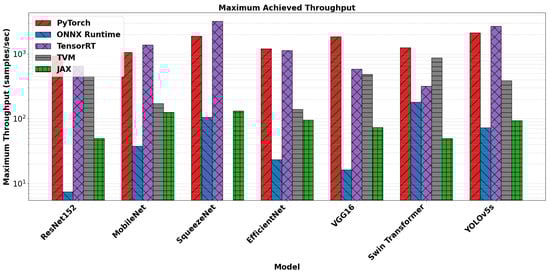 TensorRT achieved the highest throughput for nearly all models, most notably reaching 3197.10 samples/s on SqueezeNet and 1382.46 samples/s on MobileNet. These results reflect TensorRT’s ability to exploit static graph optimizations, layer fusion, and efficient kernel scheduling. Its performance scaled well with increasing batch sizes, owing to its use of precompiled, batch-optimized inference engines.