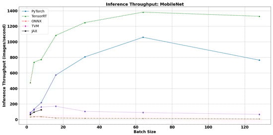 PyTorch also demonstrated impressive throughput, particularly on MobileNet, EfficientNet, and VGG16. Although it does not statically optimize execution graphs, PyTorch’s dynamic computation engine and cuDNN-based backend allow it to benefit from increased batch size. As shown in Figure 3, PyTorch maintained high throughput even at large batch sizes, suggesting efficient GPU memory usage and parallelism.