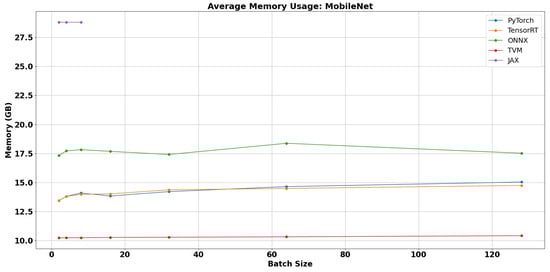 TVM consistently demonstrated the most memory-efficient behavior, consuming the least memory across all test cases. For example, it maintained MobileNet inference within approximately 10.3 GB regardless of batch size, indicating effective memory planning and lightweight runtime overhead. This efficiency likely stems from TVM’s static memory allocation strategies and custom graph compilation that minimizes redundant allocations.