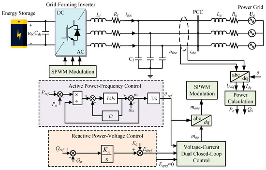 The classic grid-structured energy storage fault control strategy is introduced in Section 1.2. The active power–frequency and reactive voltage control loops are designed to, respectively, emulate the rotor motion equation of the synchronous generator and the excitation voltage regulation, while the outer power control loop can be derived as [30]