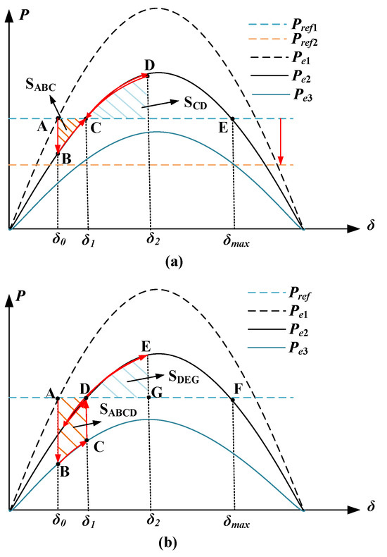 From Equation (8), it can be seen that, when the acceleration area is smaller than the deceleration area, the system tends to be stable; otherwise, transient instability occurs. Therefore, the core aspect of improving the power angle stability of the system lies in reducing the acceleration area and increasing the deceleration area. This can be achieved through two control strategies.
