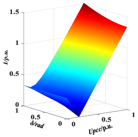 Using the fault steady-state current analytical model developed from (11), the distribution of fault steady-state current If for a given operating condition is depicted in Figure 3. Owing to the voltage support provided by VSG control, the magnitude of Upccf drops more slowly than Ugf, allowing Ugf to be treated as constant for simplified analysis. Figure 3 illustrates that If exhibits a positive correlation with power angle δ, such that the dynamic correction of the active power reference can limit If. Additionally, If shows a negative correlation with the PCC voltage, meaning that optimizing the reactive power control loop in (2) to limit the voltage support capacity can also constrain If.