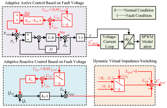 Based on the transient instability mechanism and fault overcurrent characteristics of grid-forming energy storage inverters disclosed in Section 2.2, and taking into account the needs for transient stability and fault overcurrent limitation, this paper presents an adaptive transient synchronous stability support strategy using the fault-induced voltage, comprising adaptive power control and dynamic virtual impedance coordinated control, as illustrated in Figure 4. The adaptive power control includes active and reactive control loops, where Upcc0 denotes the steady-state PCC voltage magnitude, Uref is the voltage threshold set to Uref = 1, Kpw and Kiw are the proportional–integral (PI) coefficients of the adaptive active control loop, and Kq is the proportional coefficient of the adaptive reactive control loop. The active control loop dynamically adjusts the active power reference based on the PCC voltage during faults and restores it adaptively via frequency feedback, enabling the inverter to maintain stable operation while recovering the active power as much as possible. The reactive control loop adjusts the reactive power reference in real time according to the PCC fault voltage to provide grid voltage support. Furthermore, the dynamic activation of virtual impedance serves to limit the inrush current at fault inception and the steady-state overcurrent from gradual active power recovery and voltage support.