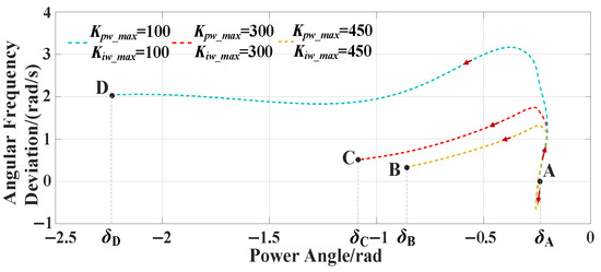 In Figure 5, point A is the initial equilibrium with power angle δA. Post-fault, the angular frequency deviates: for smaller parameters (Kpw_max = 100, Kiw_max = 100), the peak Δω is 2 rad/s, and the maximum power angle at point D is δD. Increasing Kpw and Kiw (red dashed line: Kpw_max = 300, Kiw_max = 300; yellow dashed line: Kpw_max and Kiw_max =450, Kiw_max = 450) reduces Δω toward zero, with fault-time maximum power angles δC and δB—both significantly smaller than δD. Thus, larger adaptive active control PI coefficients Kpw_max and Kiw_max effectively mitigate the angular frequency deviation and maximum power angle, enhancing the grid-connected inverter stability.