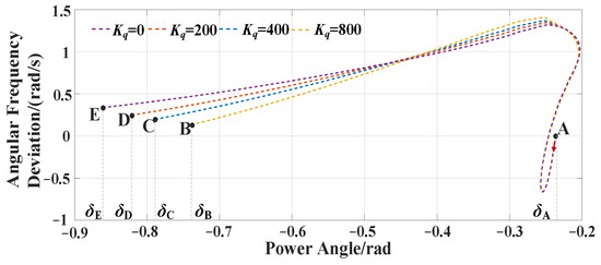 With the proposed fault voltage-based adaptive reactive power control strategy, phase plane diagrams for varying Kq under a 0.6 p.u. grid voltage sag are shown in Figure 6. As Kq increases, the maximum power angle decreases from δE→δD→δC→δB, with corresponding angular frequency deviation also reduced. Evidently, increasing reactive power enhances the system’s synchronous stability capability.