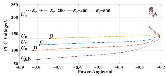 Figure 7 depicts the PCC voltage for different Kq under the same 0.6 p.u. sag. As Kq increases, the transient PCC voltage magnitude rises in the form UE→UD→UC→UB, showing a positive correlation with Kq. Concurrently, the corresponding maximum power angle decreases, as increased reactive power first supports the PCC voltage, thereby improving the maximum power angle.