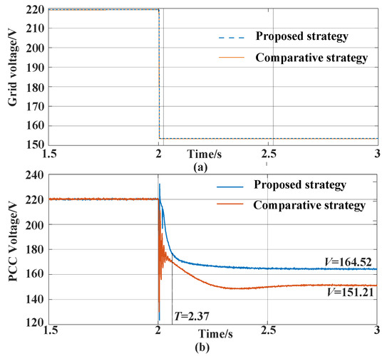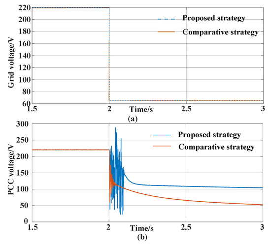 Figure 14 shows the voltage transient response waveforms under different control strategies, with the grid voltage dropping to 66 V at 2 s. As Figure 14b illustrates, under a deep voltage sag, the PCC voltage exhibits more severe oscillations between 2 s and 2.4 s, with a longer oscillation duration. Notably, between 2.4 s and 3 s, the proposed strategy stabilizes the PCC voltage at 104.23 V, hardly affecting the overall transient voltage stability. In contrast, the comparative strategy—without adaptive reactive control—sees the PCC voltage drop to 52.72 V, confirming the proposed strategy’s effective PCC voltage support under deep sag conditions.