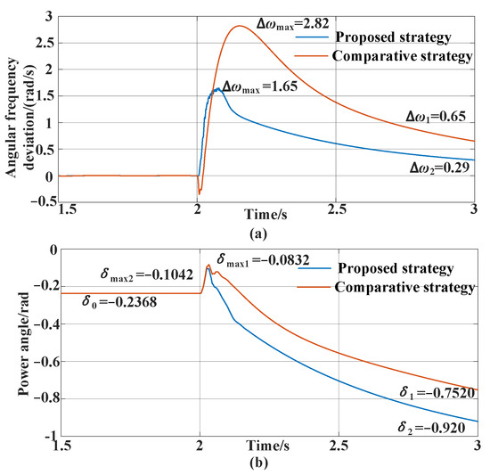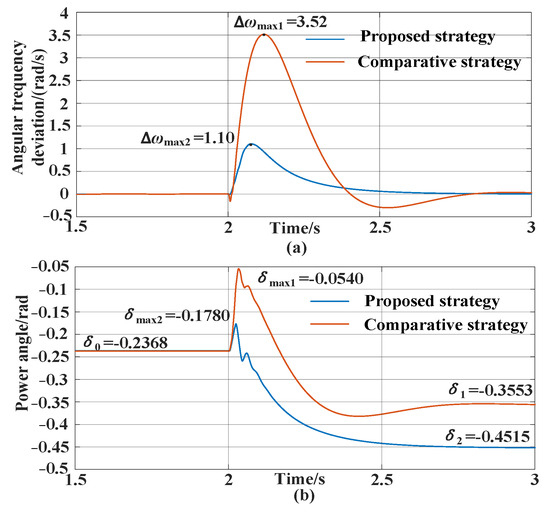 In this process, the decelerating area decreases gradually with reference recovery, and the angular frequency change rate decreases synchronously, eventually forming a dynamic balance where the angular frequency deviation converges asymptotically. The strategy does not force the elimination of the angular frequency deviation but ensures that the power angle variation remains within the stable threshold by maintaining the deviation approaching zero.