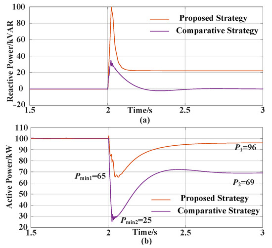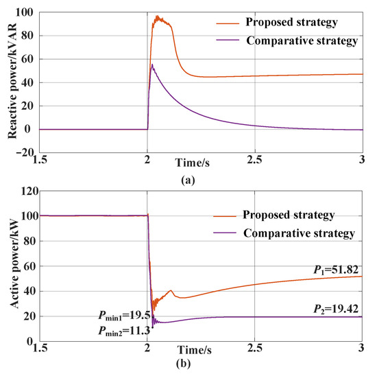 The power waveforms under different strategies are shown in Figure 12. Figure 12a shows that, during early fault stages, the grid voltage drops sharply, with the proposed strategy exhibiting a reactive power fluctuation of 100 kVar before stabilizing at 22 kVar. The comparative strategy—lacking adaptive reactive control—suffers from reactive power fluctuations from fault-induced overcurrent, stabilizing at 0 kVar. This confirms that the proposed strategy effectively regulates the reactive power to support the PCC voltage. Figure 12b shows that, at t = 2 s, the proposed strategy’s active output drops to Pmin1 = 65 kW (vs. Pmin2 = 25 kW for the comparative strategy). By t = 3 s, the proposed strategy recovers to P1 = 96 kW, outperforming the comparative strategy’s 69 kW recovery. Overall, the proposed strategy demonstrates superior active power restoration.