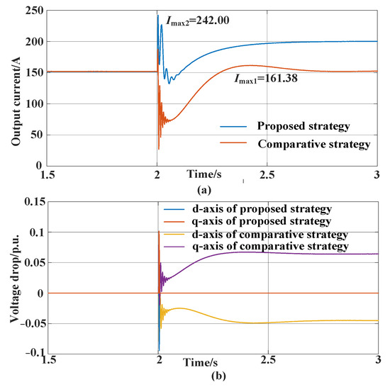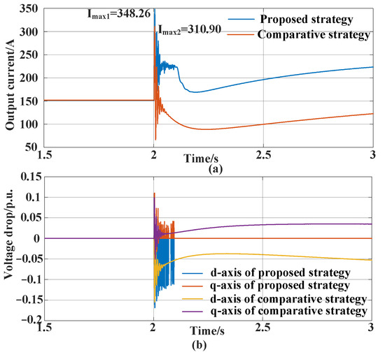 Figure 13 depicts the current and virtual impedance voltage drop waveforms for different control strategies. The comparative strategy employs constant virtual impedance switching without adaptive reactive compensation, achieving effective transient current limitation with a peak transient current of Imax1 = 161.38 A. The proposed strategy has a maximum inrush current of Imax2 = 242 A (1.61 p.u.). While its inrush current limiting is less effective than the comparative strategy, the proposed strategy restricts the inrush current to 1.61 p.u.—safeguarding the power electronics—while balancing voltage support and active power recovery. During faults, the steady-state current component, governed by the adaptive power outer loop, trends upward but stays within the 1.5 p.u. limit. Figure 13b shows that the proposed strategy activates virtual impedance at fault inception to limit the inrush current, deactivating it after the inrush current decays to zero. By contrast, the comparative strategy’s continuous virtual impedance activation—as seen in Figure 12 and Figure 13—hinders active power recovery and PCC voltage support.