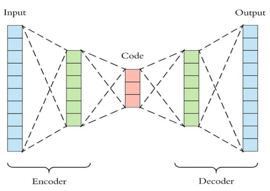 The AE architecture contains encoding/decoding operations: firstly, it converts the input data vector into a generally smaller form by the encoder. Secondly, it tries to decode the compressed vector to recover the original input by the decoder. The AE can extract important characteristics from unlabeled data after being trained in an unsupervised manner [,,,]. A traditional AE model with a single hidden layer is displayed in Figure 1.