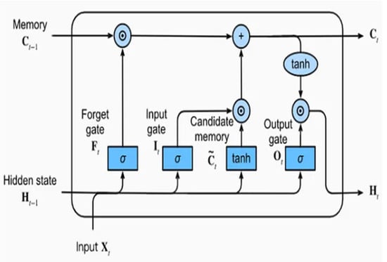 The reconstructed vector is represented by , while the decoder’s activation function is shown by ζ. An RNN LSTM unit is referred to as a memory block []. A typical LSTM architecture is shown in Figure 2. A cell (g), input (i), output (o), and forget gate(s) are all included (3). The layer of LSTM units can figure out the long-term relationships between different time-series data time steps. The hidden state (i.e., output state), which holds an output at the time step t, and the cell state, which retains knowledge gained from earlier time steps, are the two states of such an LSTM layer.