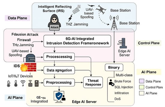 Sixth-generation networks are expected to support large-scale, heterogeneous devices and high-volume traffic flows managed through terahertz (THz) base stations, creating new operational dynamics in terms of computation, sensing, and communication []. Within this landscape, detecting sophisticated and previously unknown threats, particularly zero-day attacks, remains a significant challenge for conventional intrusion detection systems (IDSs) [].
