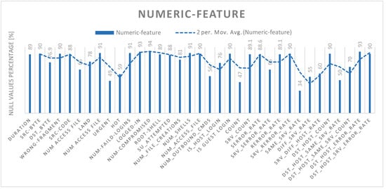 It extracts the most relevant characteristic features. The proportion of zeros is calculated for the continuous dataset’s feature. Features with more than 80% zeros are excluded from further analysis. A total of 100-dimensional feature vectors are constructed by combining the other 18 persisting features with 84 transformation vectors, while 20 variables construct the vectors of more specific features with related attributes. The resulting vector with the most correlated features is used as input to the classifier models in the next stage. Figure 4 presents a histogram of the dataset’s null values.