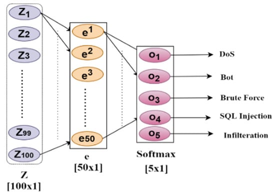 The DAE architecture was designed based on empirical analysis to ensure low reconstruction error and effective handling of high-dimensional network traffic data. A bottleneck layer with 50 neurons was selected to retain key discriminative features while removing irrelevant information, striking a balance between model complexity and generalization. During training, the reconstruction error, measured by MSE, reached an optimal value of 0.0083, validating the effectiveness of this configuration. The learned 50-dimensional feature representation was then passed to a fully connected SoftMax layer for binary or multiclass classification. A supervised fine-tuning phase was subsequently applied to further enhance classification performance, as illustrated in the corresponding architectural Figure 5.