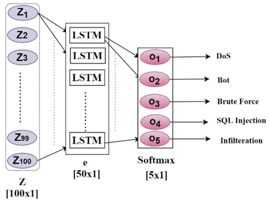 Algorithm 2 outlines the steps of alternative techniques, beginning with the MLP classifier. It is a supervised learning technique used to train this feed-forward neural network. Figure 6 shows the suggested MLP classifier mechanism. The MLP employs a SoftMax output layer for classifications and a hidden layer with 50 neurons. Moreover, the LSTM classifier (shown in Figure 7) is structured with an input layer and an output (dense) layer.