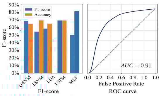 Figure 8 offers a dual-view assessment of classifier performance. On the left, the bar chart compares F1-score and accuracy across models, with the DAE outperforming all others in both metrics. Q-SVM surpasses L-SVM in F1-score, while QDA shows a slight edge over LDA in anomaly detection. LSTM maintains moderate, balanced performance. On the right, the ROC curve highlights the DAE’s strong classification capability, achieving an AUC of 0.91, indicating excellent distinction between normal and anomalous data. Collectively, these findings confirm the DAE’s robustness, achieving the best accuracy (86%), highest F1-score (80%), and outstanding AUC, making it especially suitable for intrusion detection in next-generation 6G cybersecurity systems.