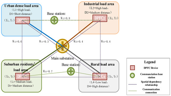 Traditional communication delay prediction methods usually only consider the communication delays of the base station and the device itself, while ignoring the spatial characteristics of the area where the device is located. With the continuous development of the power grid, the grid structure has become increasingly complex, resulting in significant differences in the regional characteristics of different power flow controllers. Therefore, for the delay prediction of different devices, their spatial characteristics should be considered even more [13]. Figure 1 shows a spatial schematic diagram of a power system with distributed devices, in which each spatial area is equipped with a DPFC device.