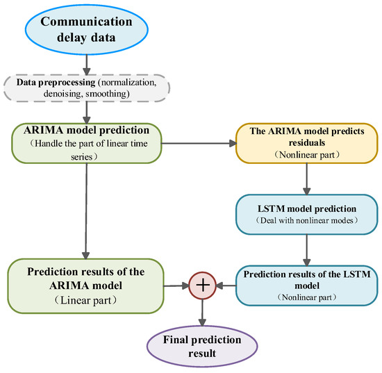 The ARIMA-LSTM hybrid model, by integrating the advantage of the ARIMA model in capturing the linear trend of data and the ability of the LSTM network to extract complex nonlinear features of data [9], compensates for the shortcomings of a single model and can effectively improve the accuracy of time series prediction. The ARIMA-LSTM hybrid model has demonstrated excellent predictive performance in multiple fields [10,11,12], and maintains a high accuracy rate in short-term predictions, which aligns with the high-precision prediction requirements for communication delay in distributed power flow control (DPFC) devices. The effectiveness of such hybrid approaches has been further validated in recent traffic flow prediction studies, where ARIMA-LSTM combinations have shown superior performance in capturing both temporal dependencies and nonlinear spatio-temporal dynamics [5], characteristics that are particularly relevant for communication delay prediction in distributed systems.