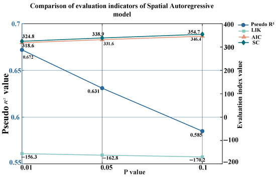 After the construction of the multivariate spatial autoregressive model is completed, it is crucial to evaluate its fitting effect. The evaluation results can not only reflect the model’s ability to interpret data but also provide a basis for subsequent optimization. This paper conducts a comprehensive assessment using indicators such as pseudo . In addition, there is the maximum likelihood pair value (Log-Likelihood, LIK), Akaike information criterion (AIC), and Schwarz Criterion (SC) [15].