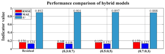 Method 1: by adopting the sequence mixing method based on residuals, relatively stable performance indicators were exhibited (RMSE = 1.56, MAE = 1.24, R = 8.92). Method 2: Model fusion is carried out through different weight combinations. Among them, the optimal effect is achieved when the weight ratio of ARIMA and LSTM is 0.3:0.7 (RMSE = 1.48, MAE = 1.18, R = 9.01), and there is a slight improvement in all indicators compared with Method 1. With the increase of the ARIMA weight, the model performance shows a downward trend. When the weight is 0.5:0.5 (RMSE = 1.52, MAE = 1.21, R = 8.97) and 0.7:0.3 (RMSE = 1.59, MAE = 1.27, R = 8.88), the prediction accuracy gradually decreases. This indicates that in this prediction task, the ability of LSTM to capture nonlinear features plays a more important role. Although the weighted mixing method with a weight of 0.3:0.7 can achieve slightly better performance, considering the stability of the model, computational efficiency, and the requirements of practical engineering applications, the sequence mixing method based on residuals has significant advantages, as follows: (1) no complex parameter tuning process is required, reducing the computational complexity; (2) it has stronger generalization ability and shows stability to different datasets. Figure 5 shows the performance comparison of the two hybrid methods under different parameter configurations.