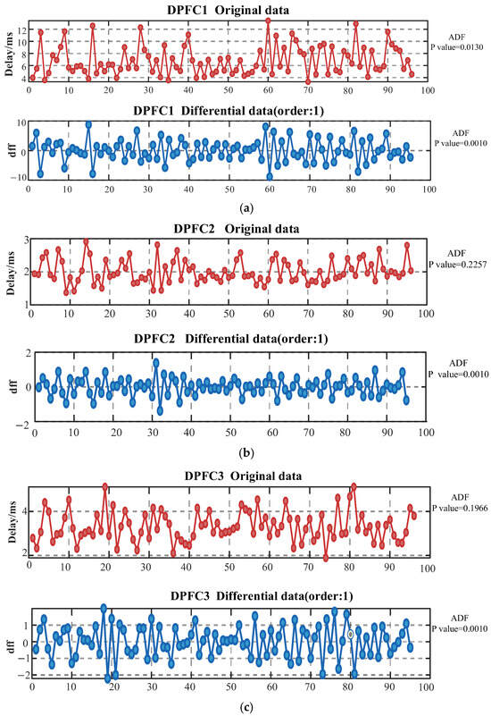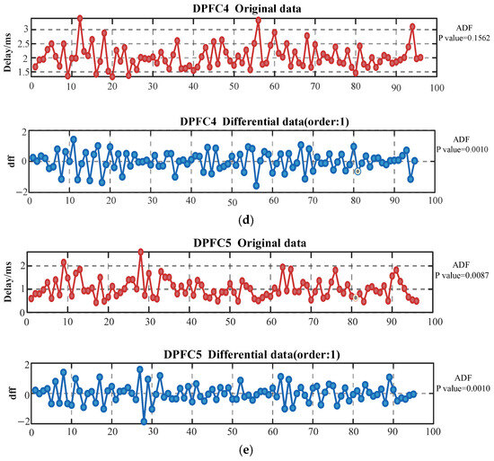 Through the analysis of the communication delay data of five DPFC devices, it can be seen that the original data all exhibit unstable characteristics to varying degrees. Among them, the fluctuation amplitude of DPFC1 is the largest (4–12 ms), and there are obvious sudden peaks. DPFC2 shows a relatively gentle fluctuation characteristic (1–3 ms) and has certain periodic changes. The ADF values of the original data of DPFC3, DPFC4 and DPFC5 were 0.1966, 0.1562 and 0.0087, respectively, all showing significant instability characteristics, further proving the instability of their time series. The significant differences in delay characteristics among devices indicate that the network conditions in different regions vary greatly, further suggesting that the spatial characteristics of devices should be considered during prediction.