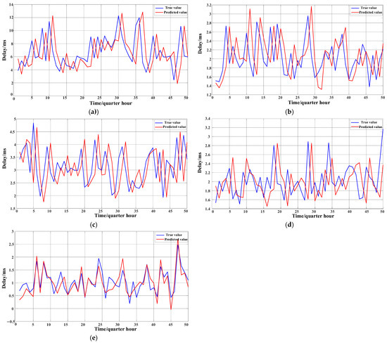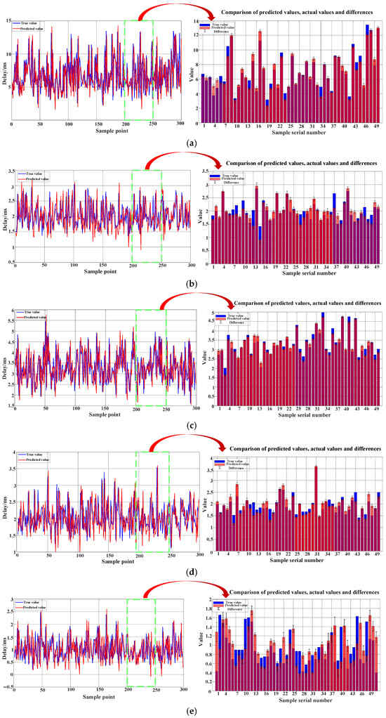 The prediction deviation of DPFC1 in the delay peak range (8–12 ms) is relatively large. Especially when there are sharp fluctuations in the time series, the dynamic tracking ability of the model is significantly limited. Although the overall fluctuation of DPFC2 is relatively small (1.4–3 ms), and the prediction curve can basically track the changing trend of the actual value, it still has deficiencies in capturing local details. The prediction results of DPFC3 fluctuate within the range of 2.5–4 ms, and the fit with the actual values is relatively good, but there is a slight lag in the response to some mutation points. The prediction results of DPFC4 and DPFC5 also exhibit similar characteristics, namely, insufficient adaptability to rapid fluctuations within a short period of time.