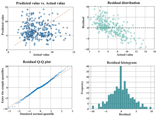 From the perspective of the overall prediction performance of the model, the scatter plots of the predicted values and the actual values are highly concentrated near the y = x diagonal, indicating that the prediction results have a strong correlation with the actual values. The quantitative evaluation indicators show that the RMSE of this model is 1.2791 and the MAE is 1.0811. The residual distribution map shows that most of the prediction errors are controlled within the range of (−5.5), and present good randomness without obvious systematic deviations. The data points in the residual Q–Q plot are closely attached to the diagonal, indicating that the residuals approximately follow a normal distribution, which verifies the rationality of the model assumptions. The residual histogram shows obvious bell-shaped distribution characteristics, further confirming the normality of the model residuals and indicating that the model has well captured the main features of the data.