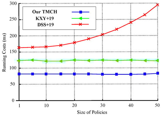 Figure 2 illustrates the relationship between the policy set size and running time for three schemes: our TMCH, KXY+19, and DSS+19. As the policy size increases from 1 to 50, TMCH maintains nearly constant performance (approximately 90–100 ms), demonstrating excellent scalability. In contrast, DSS+19 exhibits a steep increase in running time, exceeding 270 ms at the largest policy size, due to its linear complexity with respect to the policy size. KXY+19 performs better than DSS+19 but worse than TMCH, showing moderate growth with increasing policy sizes. These results confirm that TMCH is more efficient and robust under large and complex policy conditions.