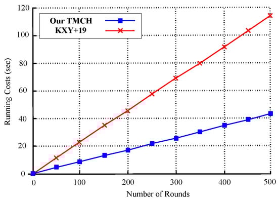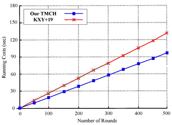 Figure 5 shows a linear comparison of the cumulative running costs for TMCH and KXY+19 as the number of executions increases from 0 to 500. Both schemes exhibit linear growth, indicating consistent time complexity per operation. TMCH demonstrates better computational efficiency, with the total running time increasing from 0 to approximately 100 s. In contrast, KXY+19 shows a steeper slope, reaching about 130 s at 500 executions. This gap becomes more pronounced as the number of rounds increases, underscoring TMCH’s superior scalability and lower per-operation cost. Such efficiency is particularly advantageous in high-frequency blockchain environments requiring repeated hash generation and verification.