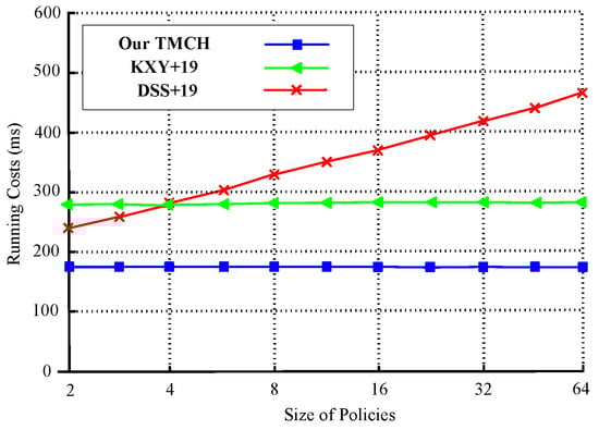 Figure 4 presents the running time under exponentially growing policy sizes, ranging from 2 to 64 for TMCH, KXY+19, and DSS+19. TMCH remains nearly flat, maintaining performance within a narrow band (around 100–110 ms), indicating logarithmic or sub-linear complexity. In contrast, DSS+19 scales poorly, exceeding 450 ms at a policy size of 64. KXY+19 demonstrates moderate scalability but still lags behind TMCH. The superior performance of TMCH under growing complexity validates its design for real-world scenarios with large attribute or policy sets.