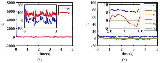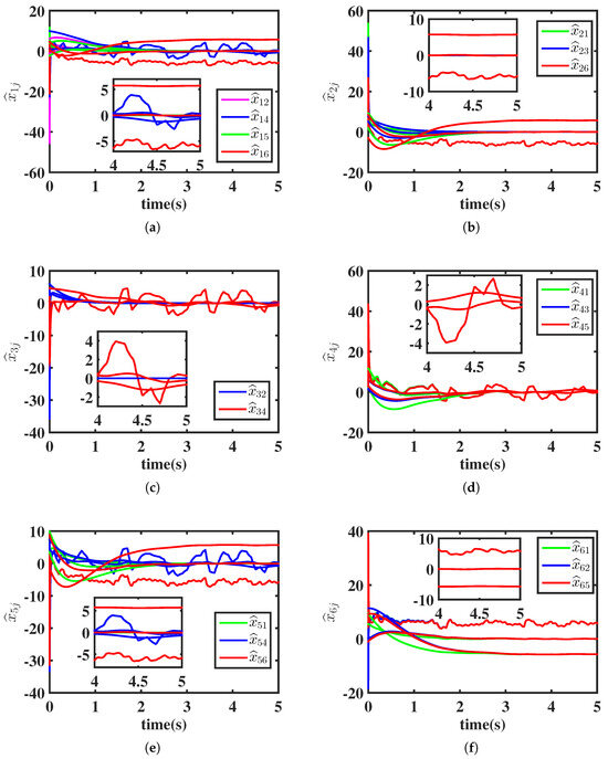 For Equation (7), choose parameters , , and such that . For the distributed fixed-time observer, let the time delay . The simulation results corresponding to Lemmas 4 and 5 are shown in Figure 3 and Figure 4. As seen in Figure 3b, the velocity state of the normal system converges to 0 within the fixed time , whereas the velocity states of the malicious systems do not converge due to the malicious attacks. Figure 4 shows the estimation error , . For , we observe the following: ; ; ; ; ; and . Therefore, it can be deduced that systems 4 and 6, or their neighbors, are malicious. To isolate the malicious influence, we just need to disconnect systems 4, 6, and their immediate neighbors from the normal systems.
