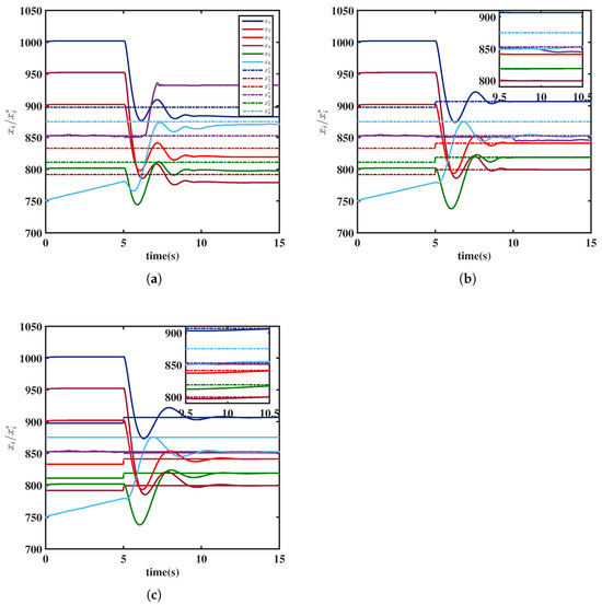 Before the malicious systems are disconnected, the NE solution of the six systems can be manually calculated as . After the malicious systems are disconnected, i.e., for , the new NE solution for the remaining four systems is calculated as . Let , , , and . The evolution of the generation system outputs is shown in Figure 5. As illustrated in Figure 5a, the outputs of all systems cannot converge to the NE due to the existence of malicious systems. Figure 5b shows that the outputs of the normal systems eventually converge to the new NE at the predefined time under the MPDD algorithm and (16). For comparison, Figure 5c displays the outputs under Equation (16) without the TBG, i.e., with , where it can be seen that the convergence time exceeds the predefined time. In summary, the simulation results verify the effectiveness of the proposed algorithms.