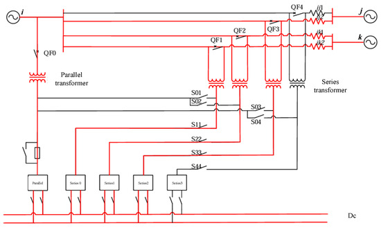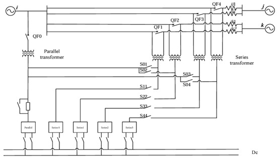 In the proposed topology, four series-connected converters are employed to inject controllable sinusoidal voltages into the regulated transmission lines. These converters generate adjustable output voltages with independently regulated magnitudes and phase angles, enabling precise control of both active and reactive power flows in the lines. The shunt-connected converter primarily stabilizes the voltage of the common AC bus and compensates for potential voltage fluctuations caused by the series converters by absorbing or injecting reactive power. Each converter is equipped with transfer switches, allowing for rapid reconfiguration to redundant topologies during contingencies (e.g., converter or line failures) or under special operating conditions. This design not only reduces the hardware redundancy and engineering costs, but also demonstrates significant advantages in system security, flexibility, and economic efficiency.
