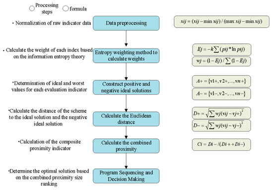 Following the entropy weight calculation, the TOPSIS method evaluates alternatives by measuring their proximity to ideal solutions. The positive ideal solution (A+) and negative ideal solution (A−) are defined as: