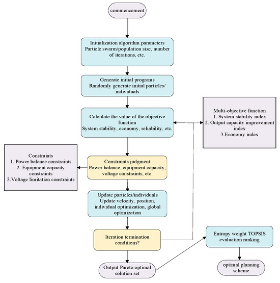 The particle swarm optimization process iteratively updates the fitness values, Pareto front, and crowding distance information of candidate solutions until the convergence criteria are met. Convergence can be determined based on the rate of change in global fitness or the stabilization of the non-dominated solution count over consecutive generations. Upon convergence, the algorithm terminates and outputs the final Pareto optimal solution set, offering decision-makers the optimal trade-offs between economic efficiency and security.
