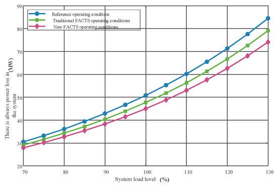 Figure 7 presents line charts showing the time-domain curves of the total active power loss under three operating conditions as the load varied. The results indicate that the system loss was highest under the base case (without FACTS devices). While the conventional FACTS case moderately reduced the loss, the novel FACTS case achieved an approximately 8.5% reduction in total active power loss. The power loss was calculated using the formula: