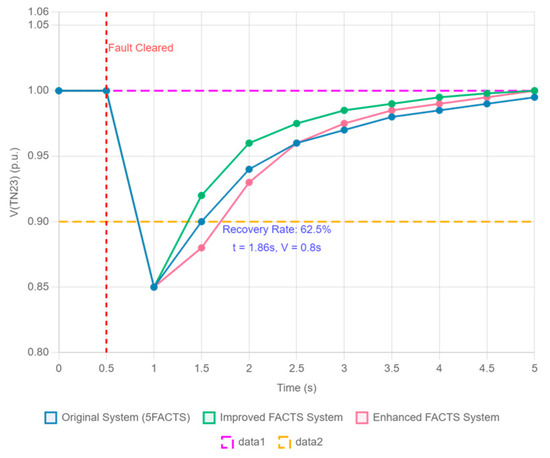 Figure 9 presents line charts illustrating the voltage recovery process at critical nodes over time under load step change scenarios. The results show that the novel FACTS device significantly accelerated the voltage recovery process, reducing the recovery time constant τ by approximately 40% compared with the conventional solution. The voltage recovery dynamics were modeled using an exponential decay function: