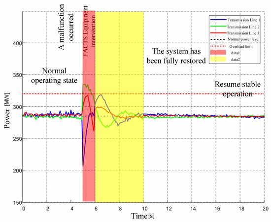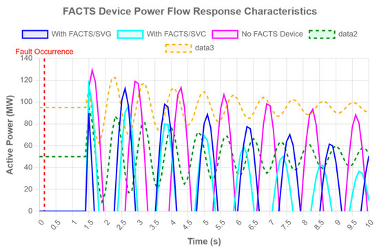 Figure 13 illustrates the power flow variations of the key transmission lines during fault occurrence and recovery using line charts. The results showed that a sudden power flow change occurred at the instant of fault inception. With the intervention of the novel FACTS devices, the power flow rapidly recovered to normal levels. Comparative data demonstrated that the proposed scheme achieved shorter response times and appropriate regulation amplitudes, effectively mitigating the overload risks.