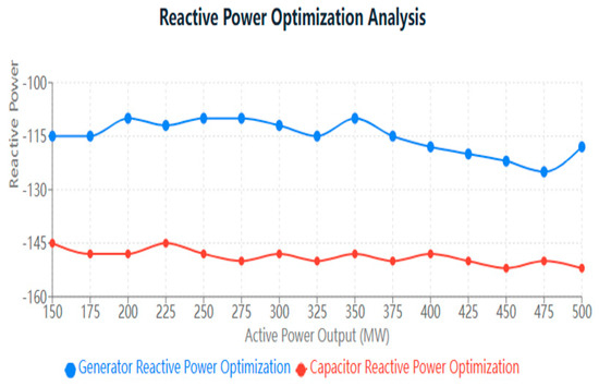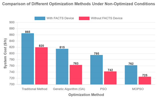 Figure 11 presents line charts comparing the system operating costs (unit: 104 CNY) under different optimization methods: conventional dispatch, genetic algorithm (GA), and MOPSO. The x-axis denotes the optimization schemes, while the y-axis represents the operating cost. The results demonstrate that the novel FACTS scheme, optimized using the proposed strategy, reduced the operating costs by approximately 12%. Additionally, the economic operation cost was calculated as: