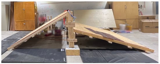 A custom-built roof mockup (Figure 1) was constructed in the laboratory to safely replicate residential slope conditions. The structure supported three inclined angles commonly seen in roofing: 0°, 15°, and 30°. The mock-up roof consisted of two opposing sloped surfaces, each measuring 8 feet by 8 feet, with the peak reaching 6 feet in height, corresponding to a 30-degree incline. The modular platform allowed us to adjust the slope angle for each trial while ensuring safety and repeatability in the experimental design. A pilot study was conducted to validate the setup, confirming that participants could perform tasks safely and consistently under each slope condition.