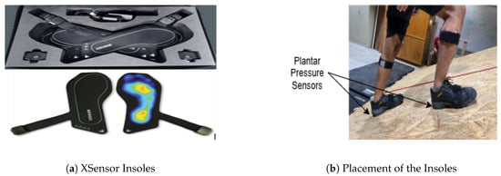 - Plantar Pressure Sensors: The XSensor Wearable Insole System captured detailed plantar pressure distributions, offering insights into center of pressure movement, asymmetry, and abrupt changes associated with fall onset. Figure 2 shows the insoles and their positions in the shoes.