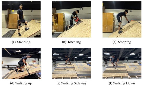 Participants performed one-minute trials of four different roofing-relevant postures (standing, stooping, kneeling, and walking) at each of the three slope angles (0°, 15°, and 30°). These postures, which involve varying levels of balance and movement, were selected to replicate typical roofing activities (as shown in Figure 4). They are also known to produce distinct pressure distribution patterns across the foot’s anatomical regions, offering a meaningful context to evaluate pressure dynamics related to balance and instability.
