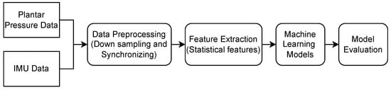 To ensure compatibility between sensor streams and to generate meaningful input for machine learning models, we applied a structured preprocessing pipeline to the raw data collected from the IMU and plantar pressure sensors. This process involved signal synchronization, feature extraction, and time-windowing, designed to preserve relevant temporal and statistical patterns associated with fall events. Figure 5 illustrates the complete data processing and modeling pipeline.