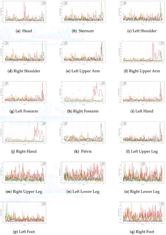 Coordinate Frames: IMU sensors in the Movella Xsens MVN system report acceleration in the local coordinate frame of each sensor unit. For this study, we used the raw acceleration magnitude () from each IMU, which is invariant to orientation and does not require coordinate transformation. No global reference frame transformation was applied to the IMU signals prior to feature extraction.