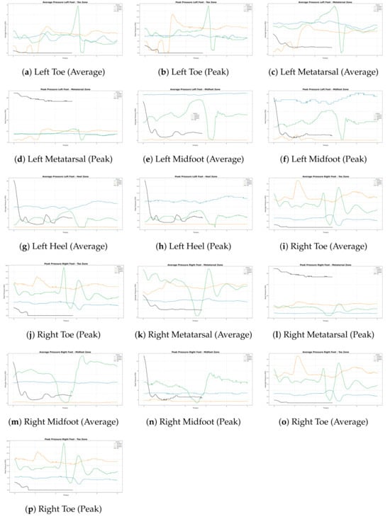 - Plantar Pressure Only (2 Sensors): This configuration uses only the Xsensor plantar pressure insoles. From each foot, we extracted two summary metrics—peak pressure and average pressure—aggregated across the insole surface. This results in 4 channels total, and after computing four statistical descriptors for each, a 16-dimensional feature vector is obtained per window.