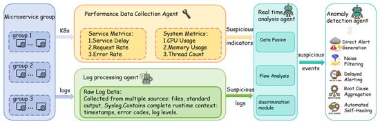 The log processing agent functions as an intelligent collection and management system for microservice logs, designed to support the real-time collection, parsing, and forwarding of diverse runtime log data. It enables multi-source and multi-destination log distribution while integrating intelligent technologies for log structuring and filtering, ensuring efficient utilization of log data. Structured logs are streamed to the real-time analysis agent via Kafka topics, enabling closed-loop data flows across modules.