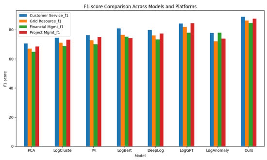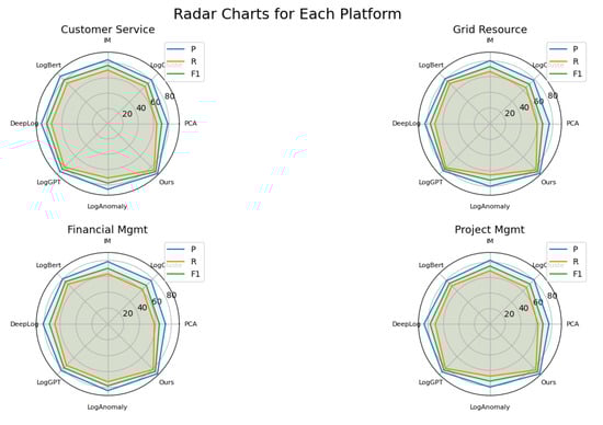 Baseline Methods Analysis. Among the baseline methods, LogGPT and LogBERT show notable improvements over traditional approaches such as PCA, LogCluster, and IM. LogGPT, in particular, delivers the second-best performance after our method, achieving F1-scores of 84.30% (customer service), 81.90% (grid resource), 77.93% (financial management), and 84.35% (project management). LogBERT also demonstrates strong performance, with an F1-score of 80.85% on the customer service platform. In contrast, DeepLog and LogAnomaly maintain relatively strong but less competitive results. For example, on the financial management platform, LogAnomaly achieves F1 = 77.89%, outperforming DeepLog (73.39%) and IM (70.00%), yet falling short of our approach (84.58%).